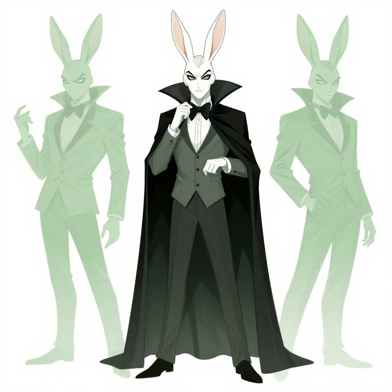 Digital illustration of a white anthropomorphic rabbit in a black tuxedo and cape, standing confidently with a hand on his chin, surrounded by two translucent