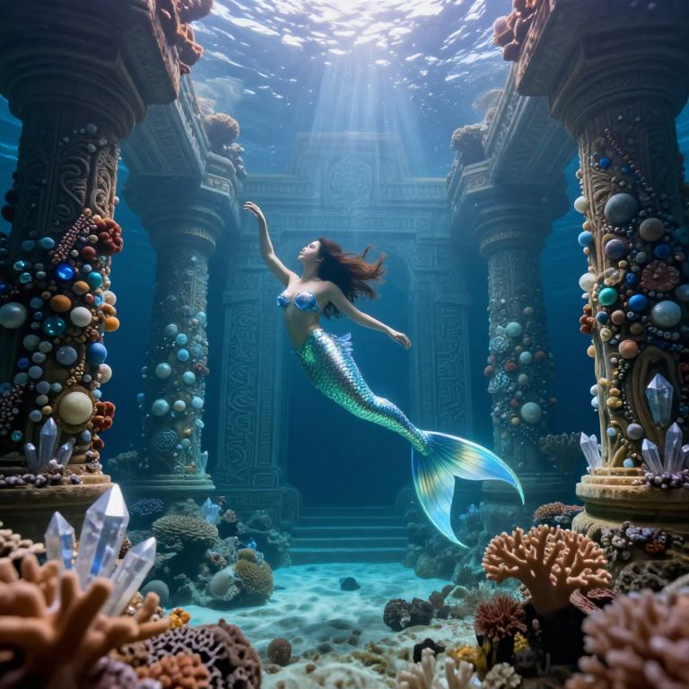 A tranquil and enigmatic underwater scene reminiscent of James Cameron's ethereal landscapes captures an enchanting moment where a mermaid princess with shimmering scales performs gracefully in an ancient coral sanctuary. Her fluid movements exude grace and intrigue, transcending the depths as she pirouettes around colossal columns embellished with precious stones and gleaming crystals. The magical glow from her tail illuminates intricate patterns etched into the temple walls, while sunlight filtering through the clear waters above casts shimmering rays upon this serene scene, accentuating the ethereal beauty of the hidden world below and inviting viewers to explore the depths of her captivating dance.