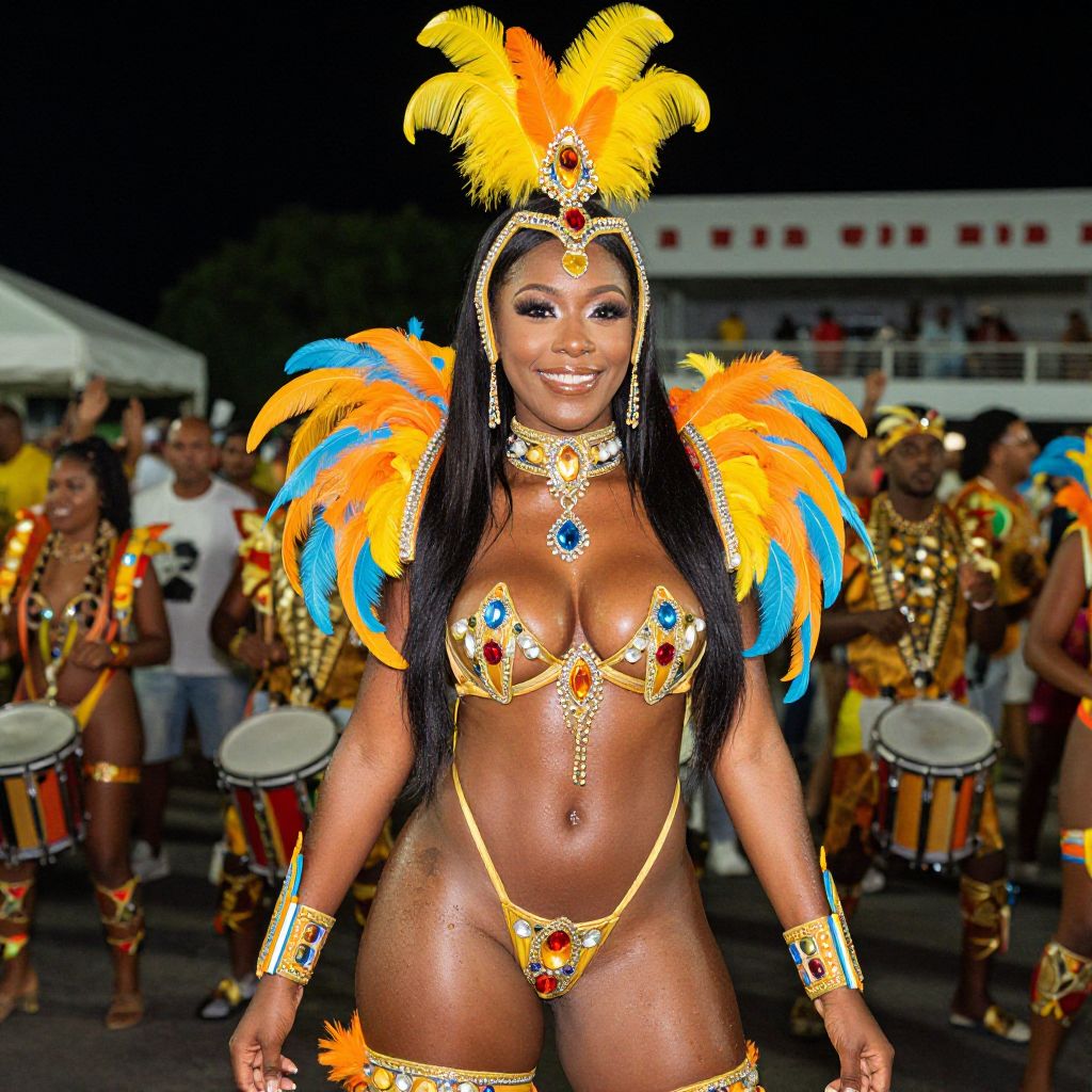 Photograph of a vibrant, confident Black woman with dark skin and long black hair, wearing a colorful Carnival costume. She has a bright yellow feathered headdress, orange and blue feathered shoulder pieces, and a gold bikini adorned with gemstones. Her jewelry is elaborate, matching the costume. She's smiling, standing in front of a cheering crowd and drummers in the background. The setting is an outdoor stadium at night.