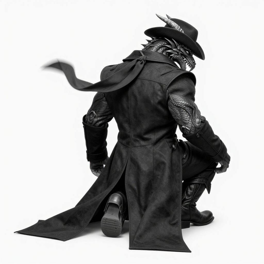 Male, soro, Anthro, demihuman, muscular, dragon, western dragon, Eastern dragon, dragon skin, tow horn, clothed, clothing, ((cowboy wear, neckerchief, fluttering neckerchief.swaying neckerchief, coat, coat hem, stretched coat, Draw neatly all the way to the hem, cowboy hat, gloves, cowboy boots)) realistic hands, 8k hd, extreme detail, extremely detailed, 2d clear, simple background, Full body image, High resolution, Binarization, back view, lower half with coat cover, squat, Droopy hem. Kneel. Crouch down. hem hanging down to the ground, hem on the ground