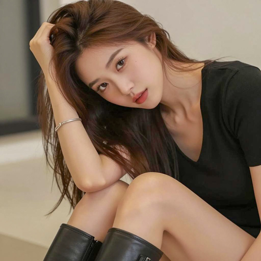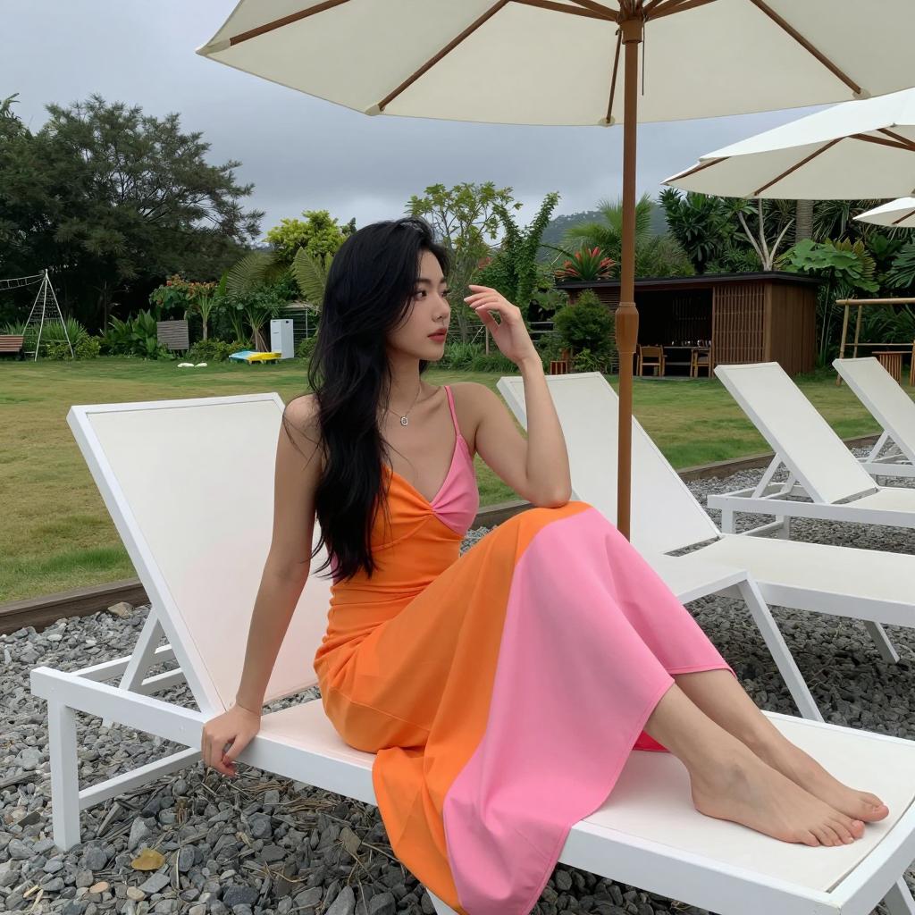Woman with long black hair, wearing a strapless beige dress and black knee-high boots, sits relaxed in a modern chair. Sunlight streams through large windows behind her. Glass coffee table with books and decorative items in the foreground. Wooden floor. Sun glare creates starburst effect in the window.