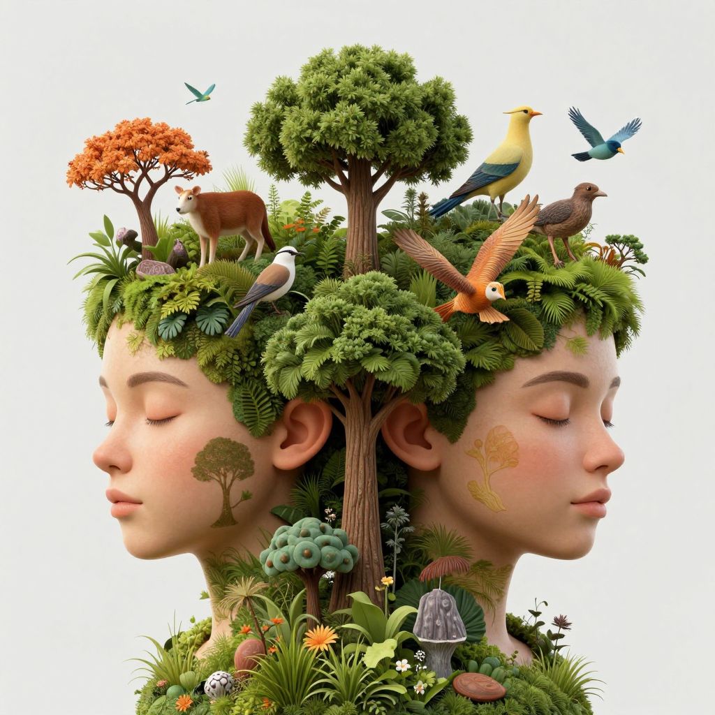 A surreal 3D-rendered artwork depicts two individuals with closed eyes, their heads transformed into lush, vibrant ecosystems where trees, animals, and birds coexist harmoniously, creating a dreamlike, high-definition fusion of human and nature.