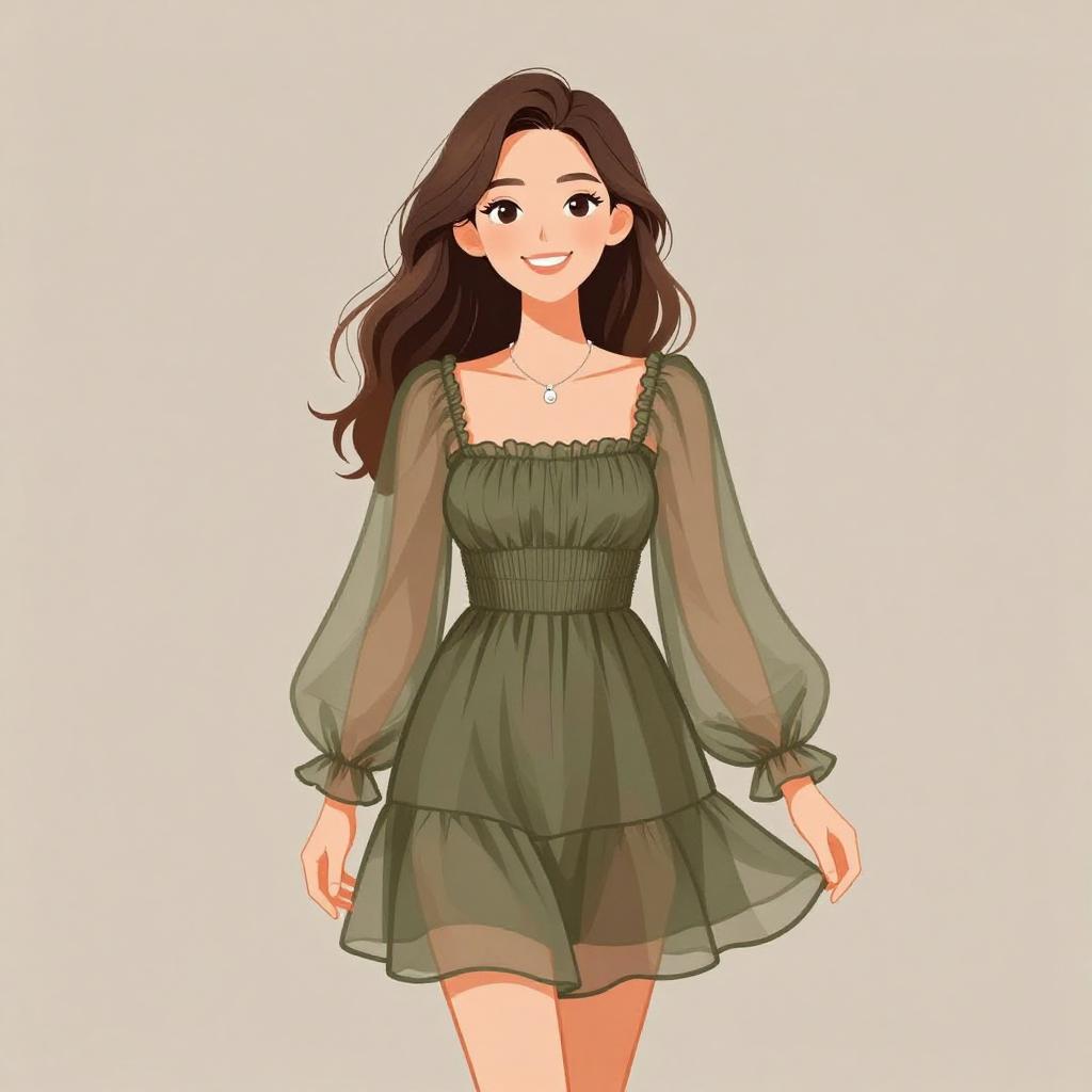 Woman with pretty face and pretty hair. smiling Woman, romantic boho, sheer olive green mini dress, smocked bodice, square neckline, sheer long sleeves with ruffled cuffs, tiered skirt, delicate silver pendant necklace, soft wavy hairstyle with side parting, neutral studio background. --sref 1467