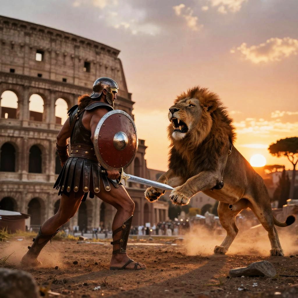 Photograph of a muscular gladiator in gold armor and black skirt, holding a spear, battling a roaring lion in a dusty arena.