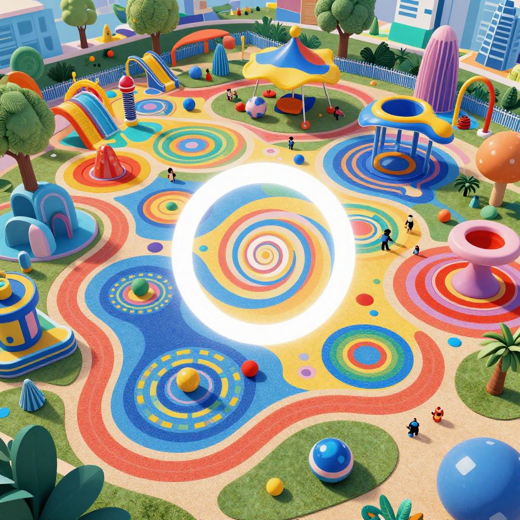 This vibrant digital artwork depicts a colorful, oversized playground in a city park. The playground features swirling, multicolored patterns on the ground with large, concentric circles in blue, yellow, red, and orange. Various whimsical play structures, including a rainbow-striped slide, a yellow and blue tent, and a blue and purple climbing frame, are scattered throughout. Small, black figures of children play among the structures. The background includes tall buildings, trees, and a white picket fence. Brightly colored balls and a large blue exercise ball are scattered on the grass. The overall style is playful and cartoonish, with bold colors and exaggerated shapes.