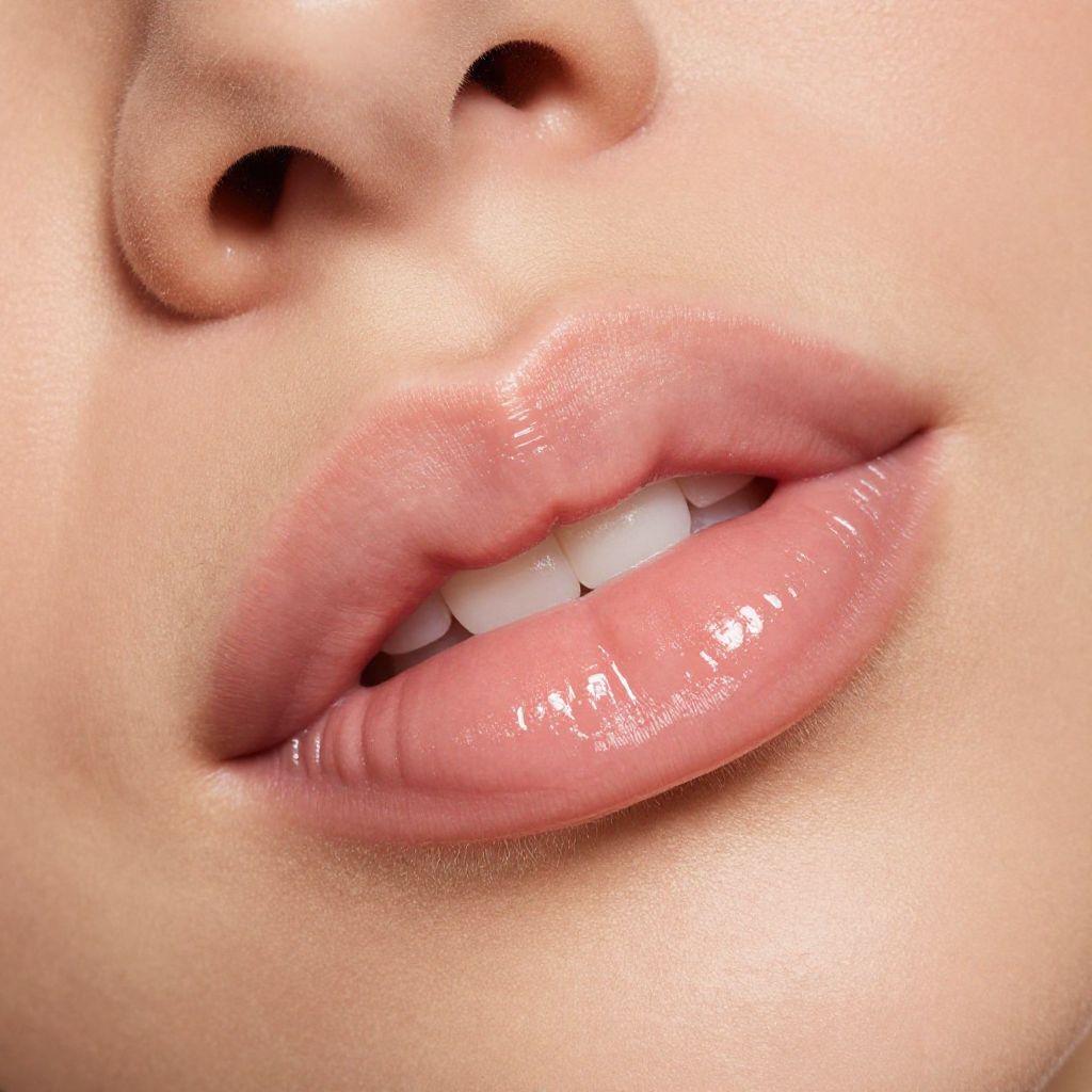 This is a close-up photograph of a person's lips and nose. The image focuses on the full, glossy pink lips, which are slightly parted to reveal white teeth. The skin around the lips and nose is smooth and fair, with a subtle shine. The nose, located in the upper left corner, has small, dark brown nostrils. The texture of the skin and lips is finely detailed, highlighting the natural sheen and slight imperfections. The background is out of focus, emphasizing the lips and nose. The overall composition is intimate and detailed, drawing attention to the natural beauty and texture of the skin and lips.