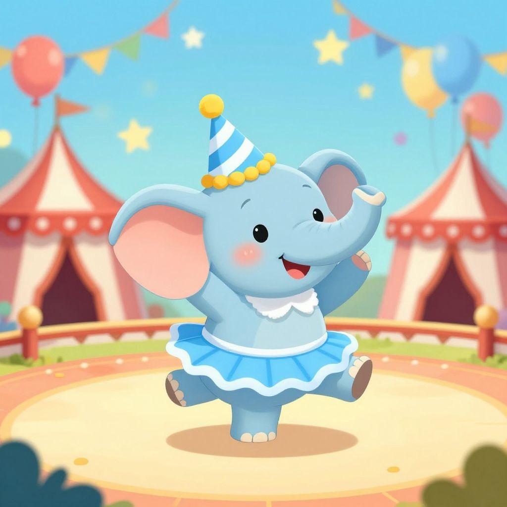 Illustration of a cheerful cartoon elephant wearing a striped party hat and a decorated blue tutu performing a dance in a circus ring. The background features festive circus tents, colorful balloons, bunting flags, and stars, creating a lively and whimsical carnival atmosphere.
