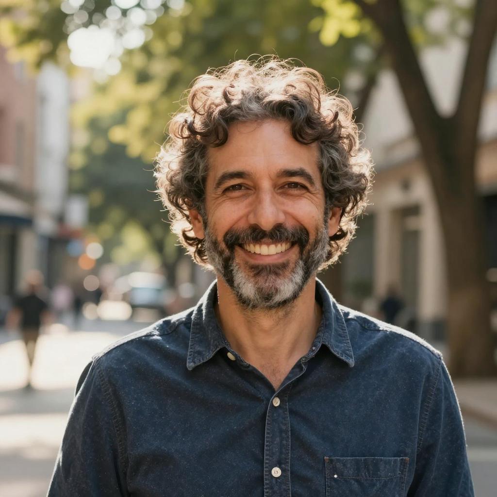 Photograph of a middle-aged man with curly, gray-brown hair and a beard, smiling warmly. He's wearing a dark blue, patterned button-up shirt. The background shows a sunlit urban street with blurred green trees and a building, creating a warm, inviting atmosphere. The sunlight filters through the trees, adding a golden glow to the scene. The man's relaxed, friendly expression adds to the overall positive vibe.