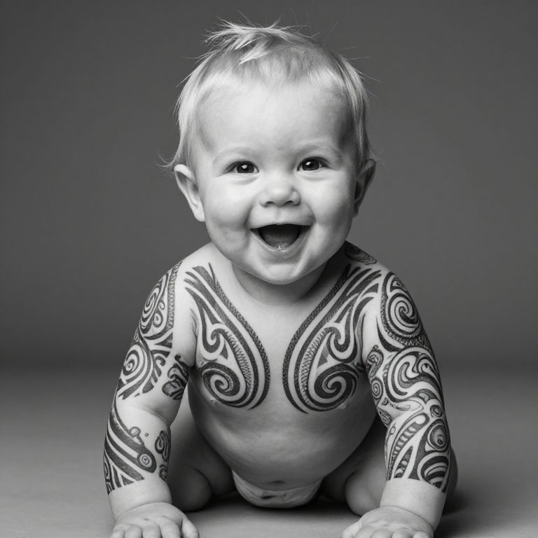Olaf a blonde European 9 months old smiling happy baby with a full face Maori tattoo and a full body Maori tattoo - black and white very detailed professionals baby photograph,