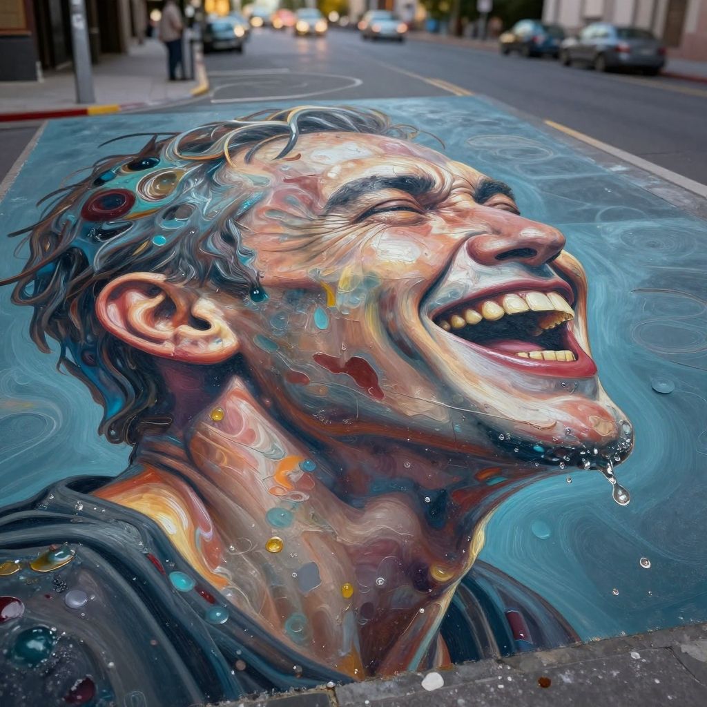 Vibrant street painting of a laughing man with colorful, water-like textures, wet hair, and dripping paint, set against a city street background.