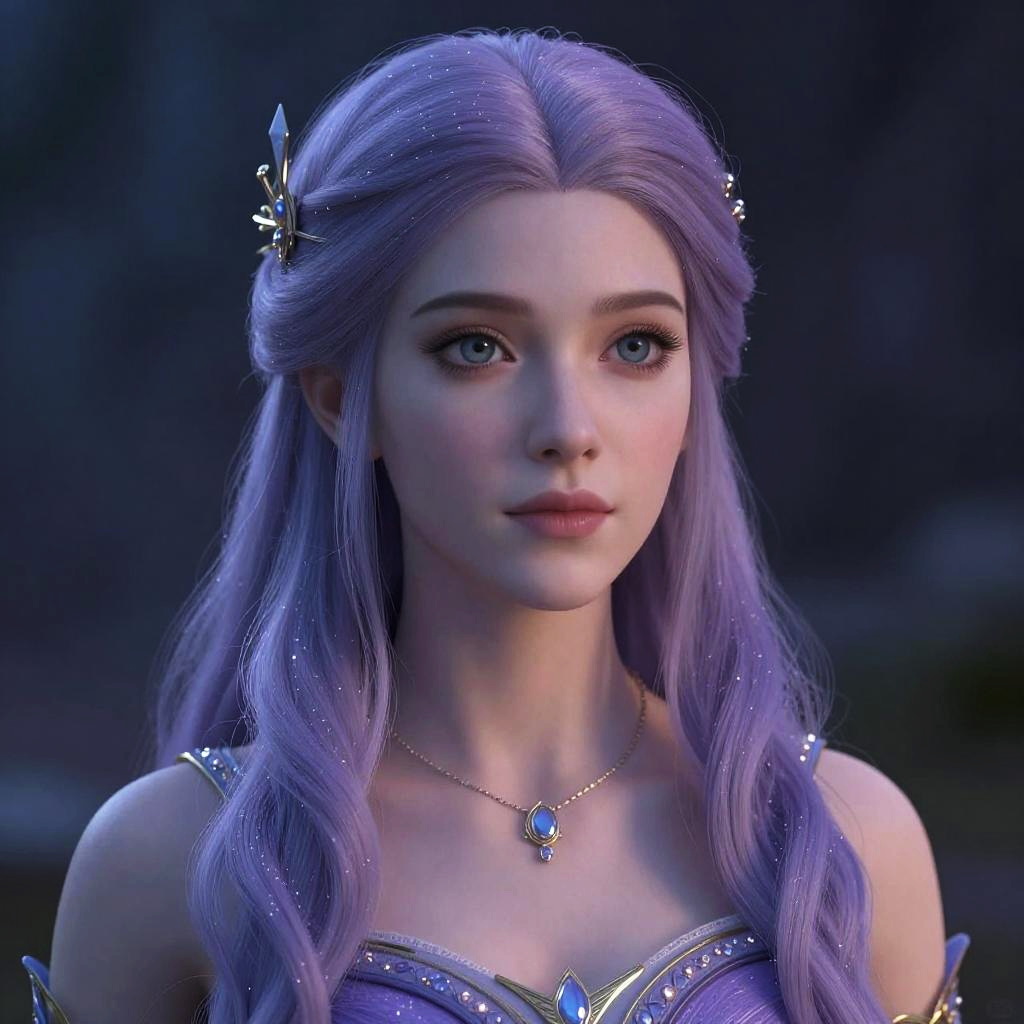 A realistic, feminine forest nymph with gentle, moss green hair, rendered in HD for a lifelike appearance. The portrayal captures her peacefulness and charm, blending classic fairytale elements with realistic detail.