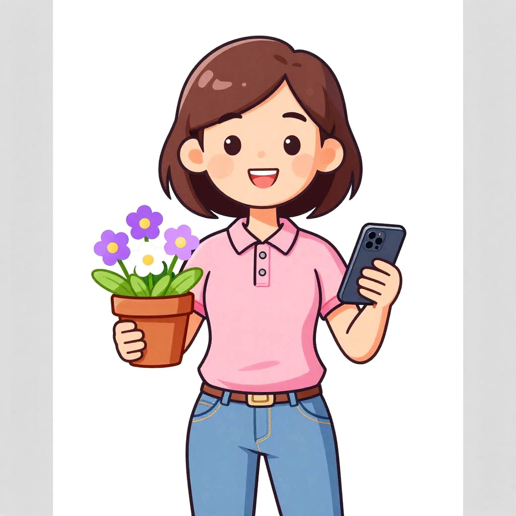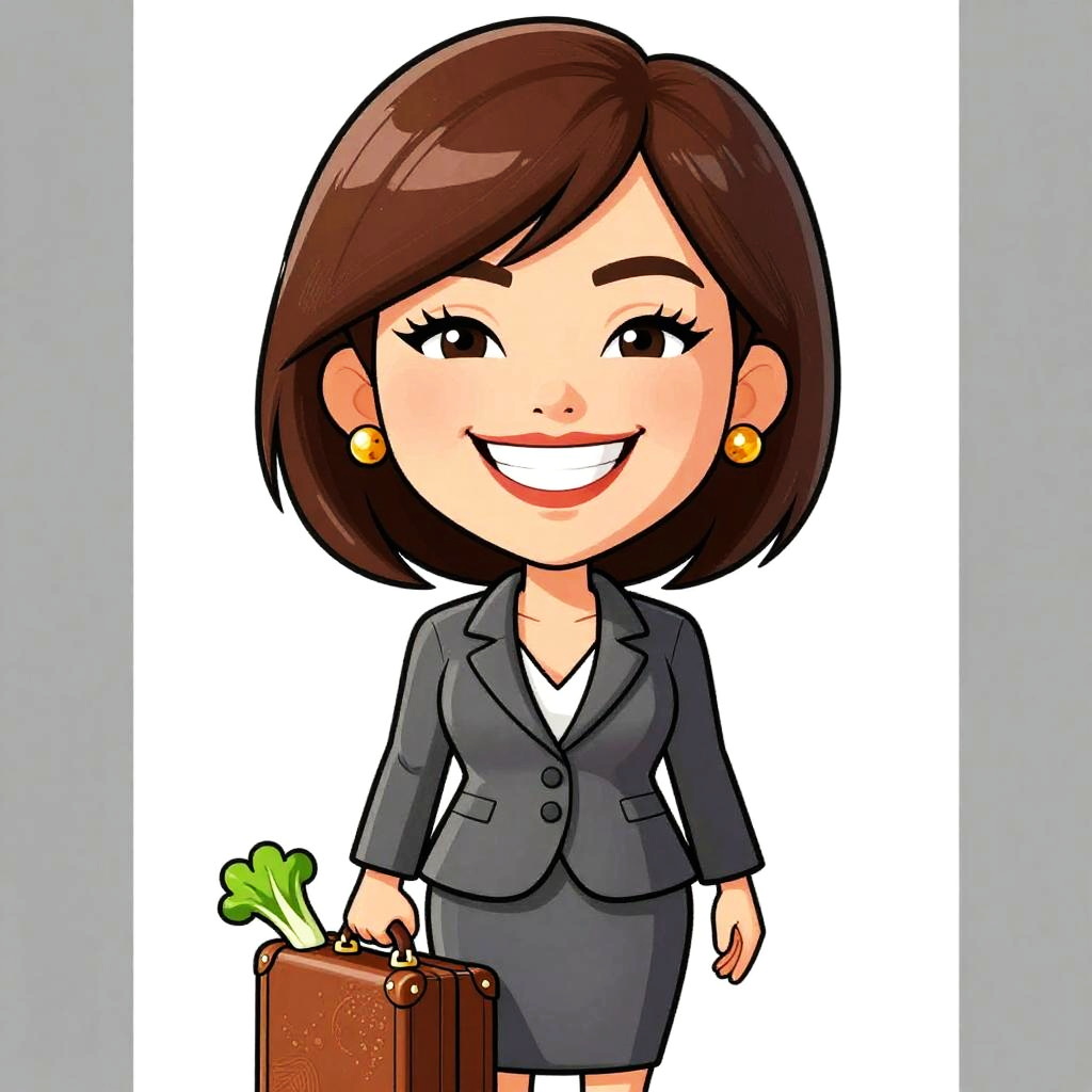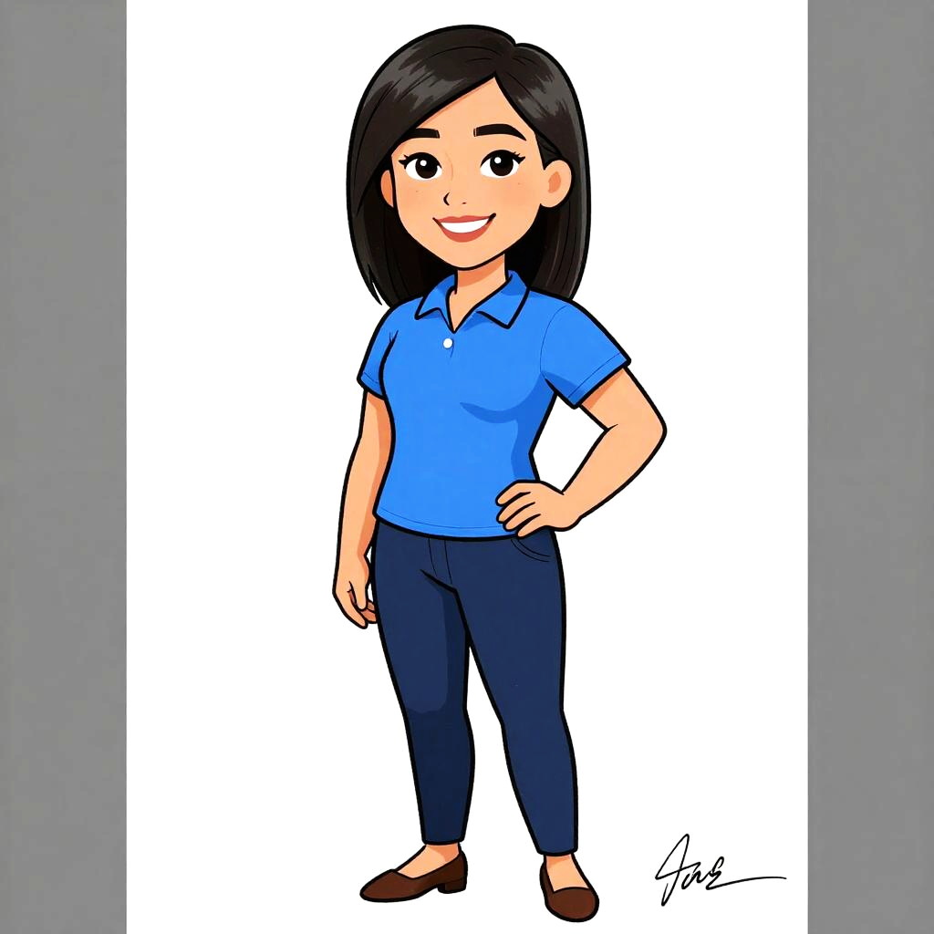 This is a digital cartoon drawing of a smiling woman with straight black hair, wearing a blue short-sleeve polo shirt and dark blue pants. She's standing with one hand on her hip and the other hanging down, looking directly at the viewer. She's wearing brown shoes and has a fair skin tone. The background is plain white with a grey border on the left and right sides. The artist's signature is in the bottom right corner.