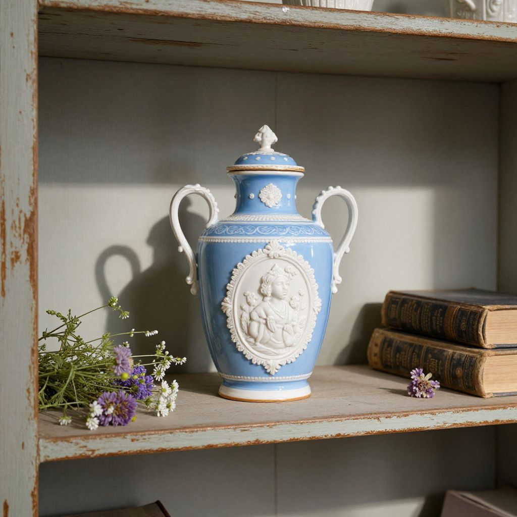 A picturesque scene featuring Wedgewood pottery displayed on a vintage wooden shelf, exquisite relief details in sky blue jasperware, surrounded by delicate wildflowers and antique books, sunlit room with soft shadows, evoking timeless elegance and heritage craftsmanship.