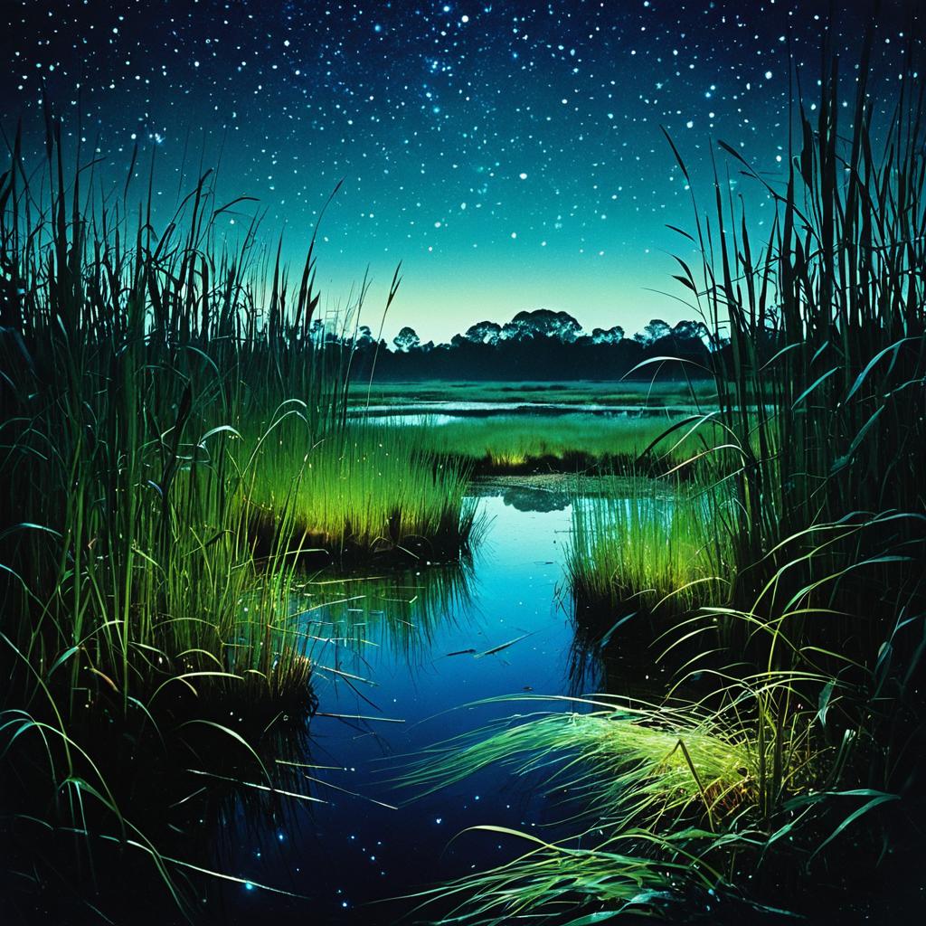 Fantasy landscape of bioluminescent marshes with waterfalls, lush greenery, warm sunlight breaking through clouds, sense of wonder and adventure.