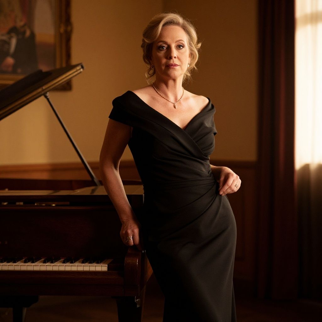 Photograph of an elegant older woman with blonde hair, wearing a black off-shoulder dress, standing beside a grand piano in a warmly lit room