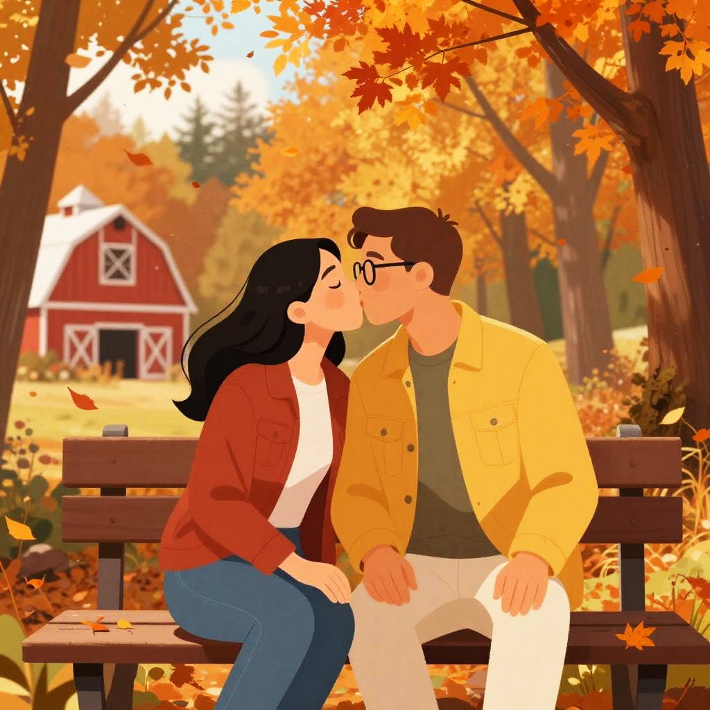 A vibrant digital illustration of a couple sitting on a bench in an autumn forest. They're facing each other, sharing a gentle kiss, with orange and red leaves falling around them. The woman has long black hair, wears a red jacket and blue jeans, while the man has short brown hair, glasses, a yellow jacket, and white pants. A red barn and forest are in the background, bathed in warm, glowing light.
