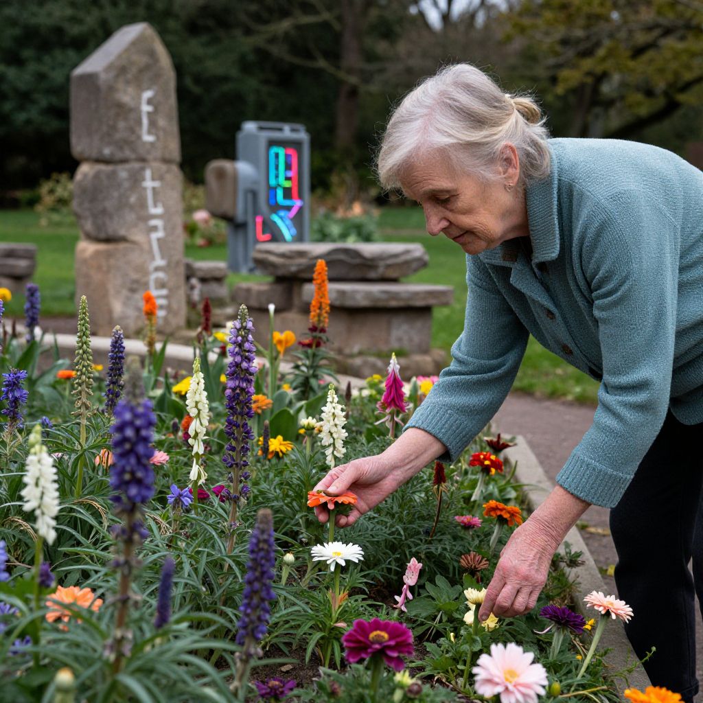 Elderly woman with white hair, wearing a blue sweater, tends a vibrant garden filled with colorful flowers, near a stone tombstone and colorful sign