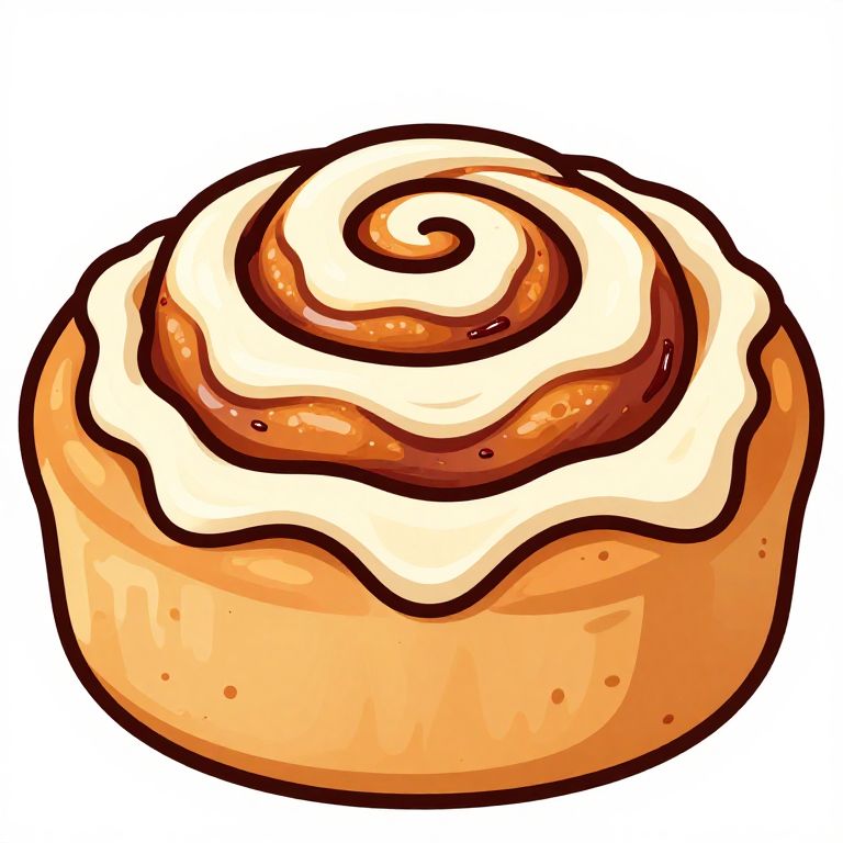 Cinnamon bun clipart, a close-up of a freshly baked cinnamon roll with oozing icing, high contrast cartoon style with exaggerated swirls and vibrant highlights, isolated on white background for clear use in designs