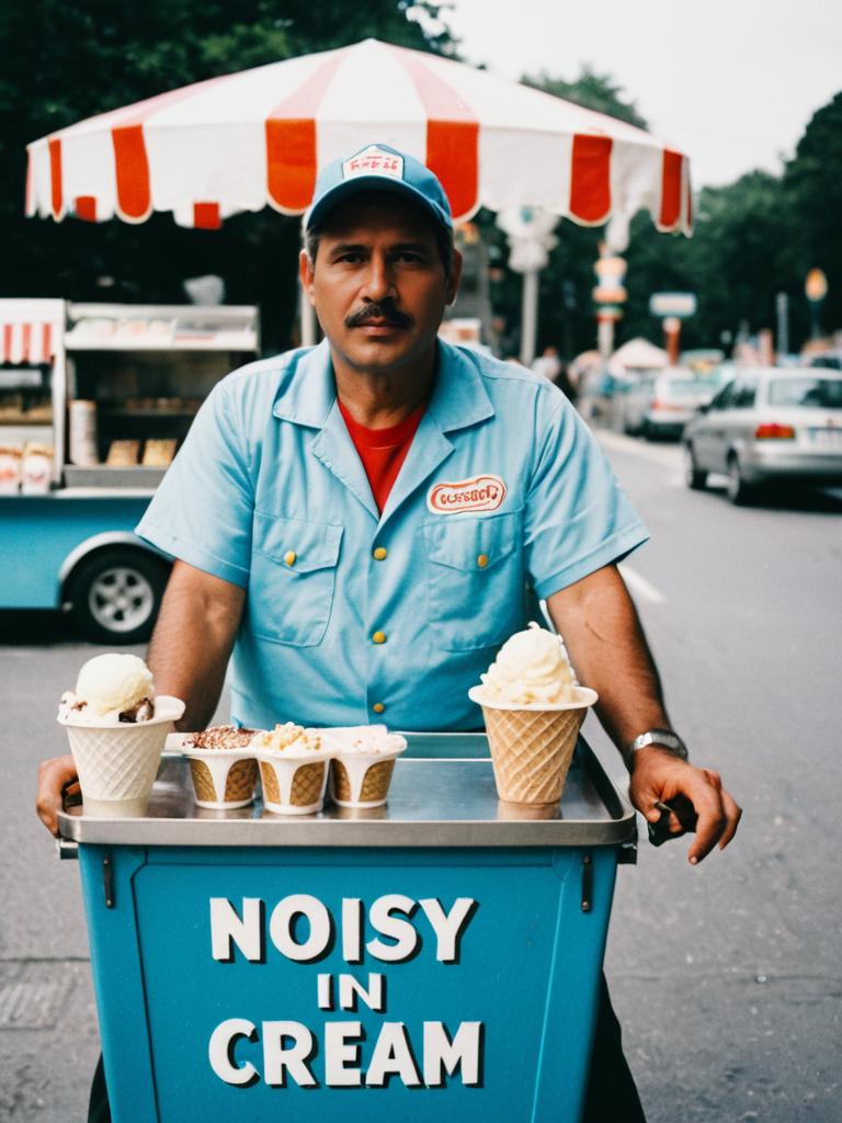 Portrait of a man dressed in a light blue ice cream vendor costume, holding a soft serve ice cream cone. He stands next to a metal ice cream cart with a striped red and white canopy. The vendor wears a matching cap and has a short beard with gray streaks. The urban outdoor setting includes blurred pedestrians and umbrellas in the background.