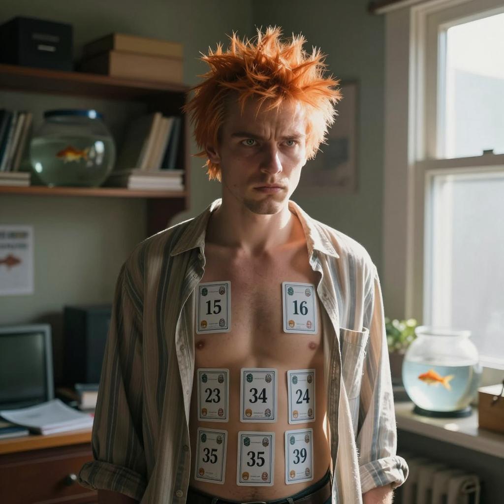 Photograph of a man with spiky orange hair, wearing an open, striped shirt, exposing his chest with numbered cards. Sunlight streams through a window on the right, illuminating cluttered shelves and a fishbowl in the background. Intense expression on his face. Man stands slightly off-center, with a cluttered, dimly lit room behind him.