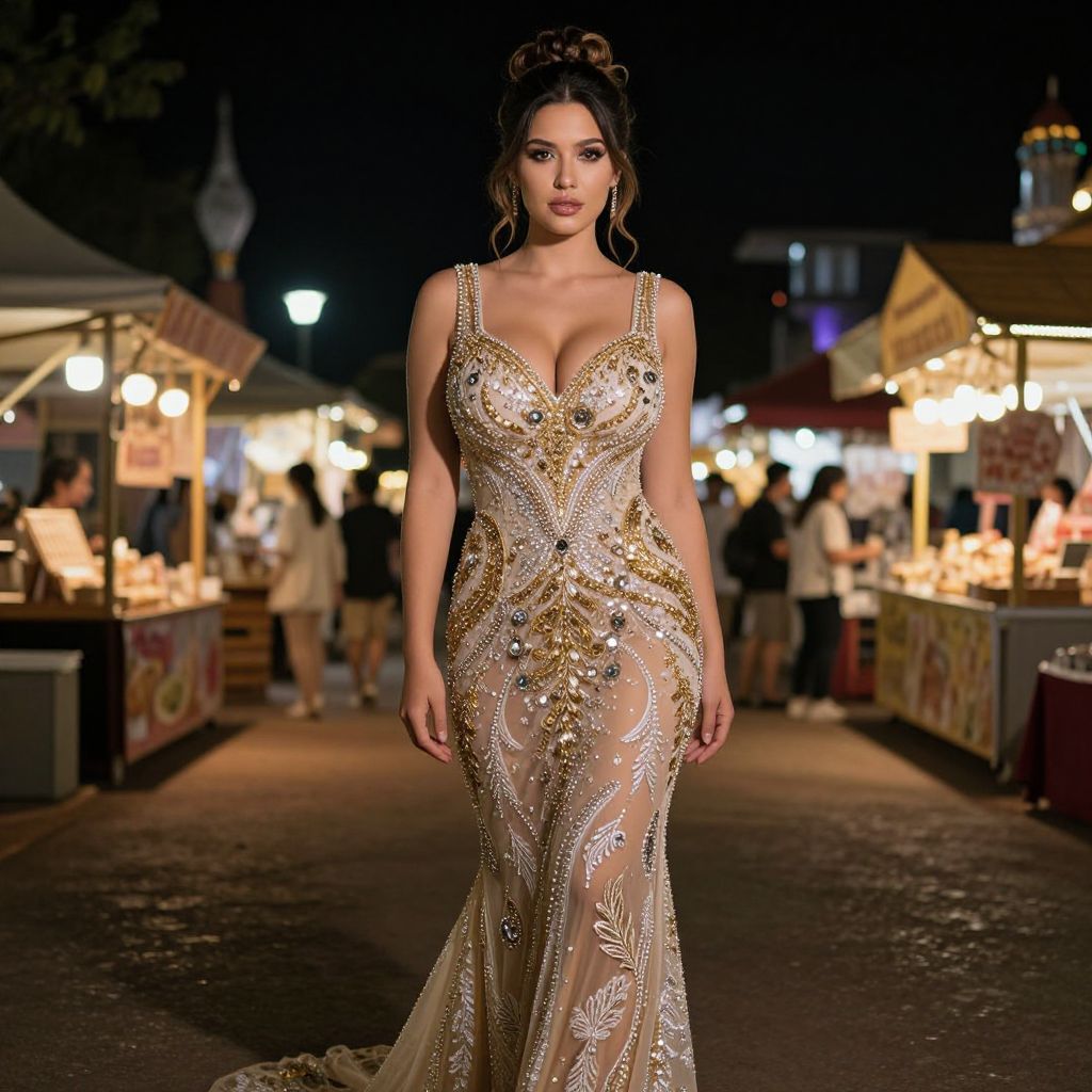 Photograph of a confident, curvy woman with dark hair in an updo, wearing a revealing, form-fitting, sheer gown adorned with gold and silver floral embroidery and sequins, highlighting her large breasts and hourglass figure. She stands in a nighttime outdoor market, with warmly lit stalls and blurred figures in the background. The market has a rustic feel, with wooden stalls and hanging lights. The woman's gown is predominantly beige with intricate gold and silver details, creating a glamorous contrast against the dark, bustling market setting.