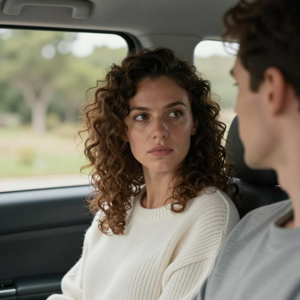 Photograph of two people in a camper van. Man with curly brown hair, light skin, wearing a beige jacket and maroon shirt, sits in the driver's seat, looking ahead. Woman with light skin, brown hair in a bun, wearing a plaid scarf and blue jeans, sits beside him, looking at him. Window with curtains in the background. Daylight through window.