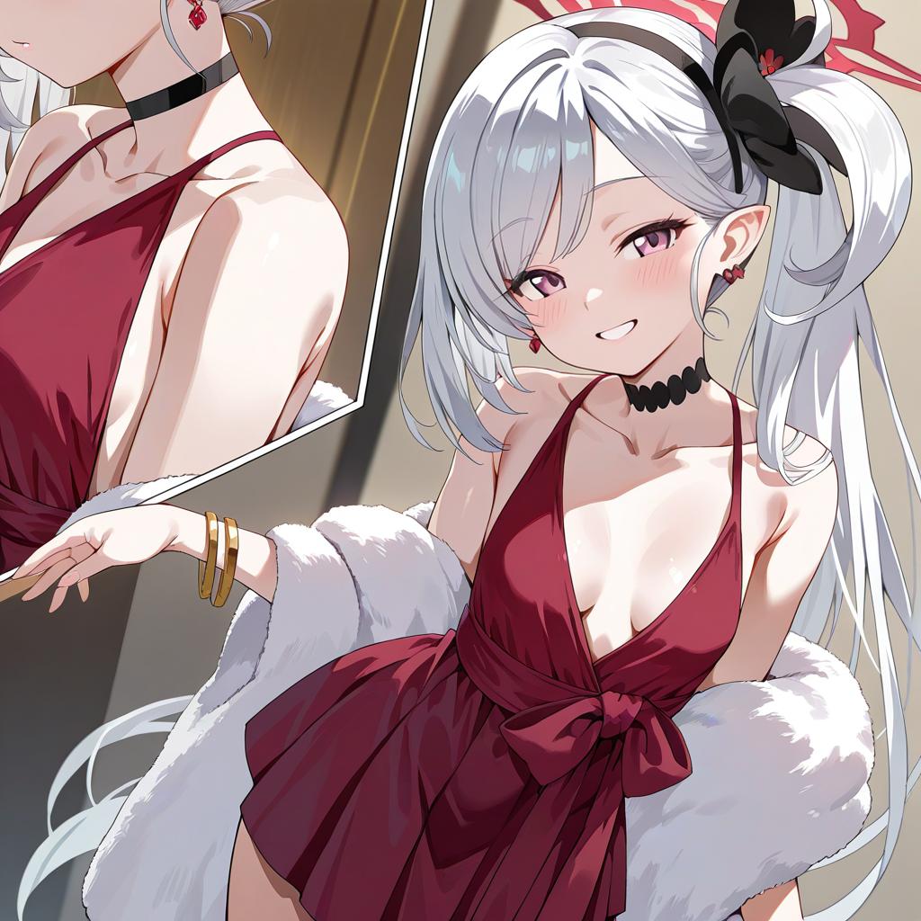 Mutsuki (dress) (blue archive), blue archive, 1girl, pointy ears, purple eyes, pink eyes, long hair, white hair, grey hair, black hairband, side ponytail, small breasts, collarbone, red dress, sleeveless dress, halo, red halo, bare shoulders, black choker, bracelet, earrings, white fur, shawl, by artist club3, illustrious