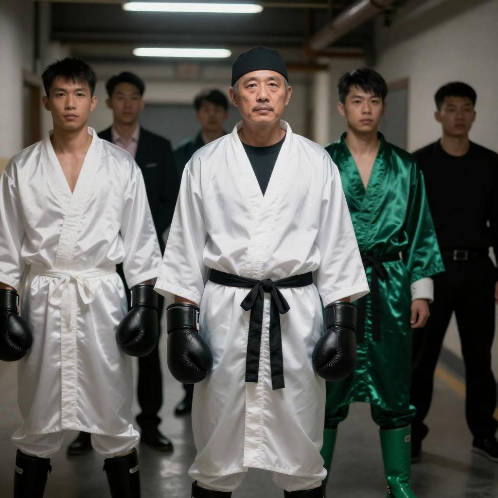 Two Asian men sparring in a martial arts training session. One man wearing a white headband, white gi jacket, and hand wraps grimaces while defending against a punch from his opponent. Both fighters are dressed in white clothing and have their hands wrapped for protection. The activity takes place indoors in a dimly lit room.