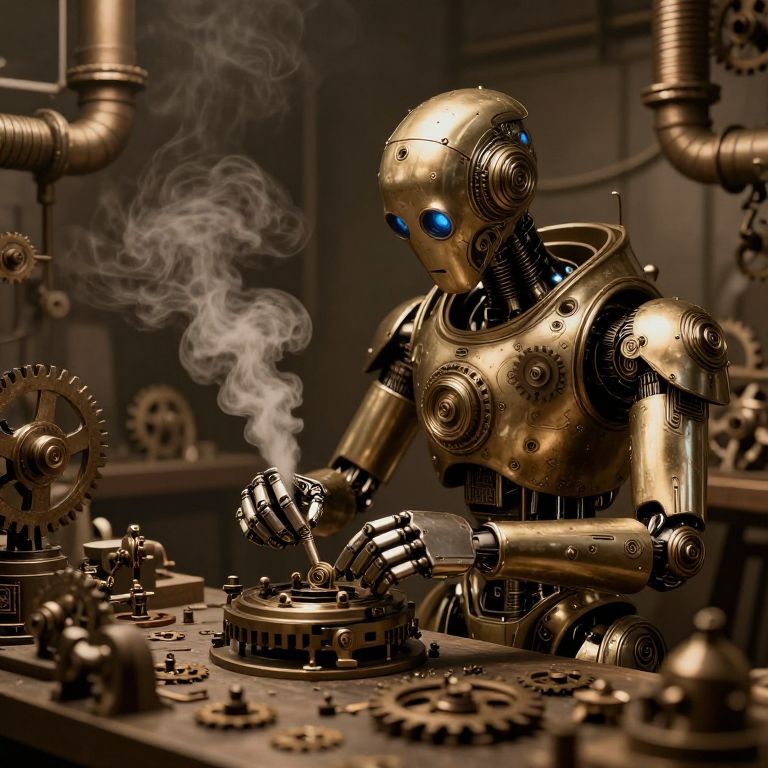 A steampunk-inspired golden android with glowing blue eyes is assembling mechanical parts in an elaborate vintage workshop. The scene features intricate gears, steam pipes, and warm sepia tones, showcasing detailed craftsmanship and a classic science fiction aesthetic with soft dramatic lighting.
