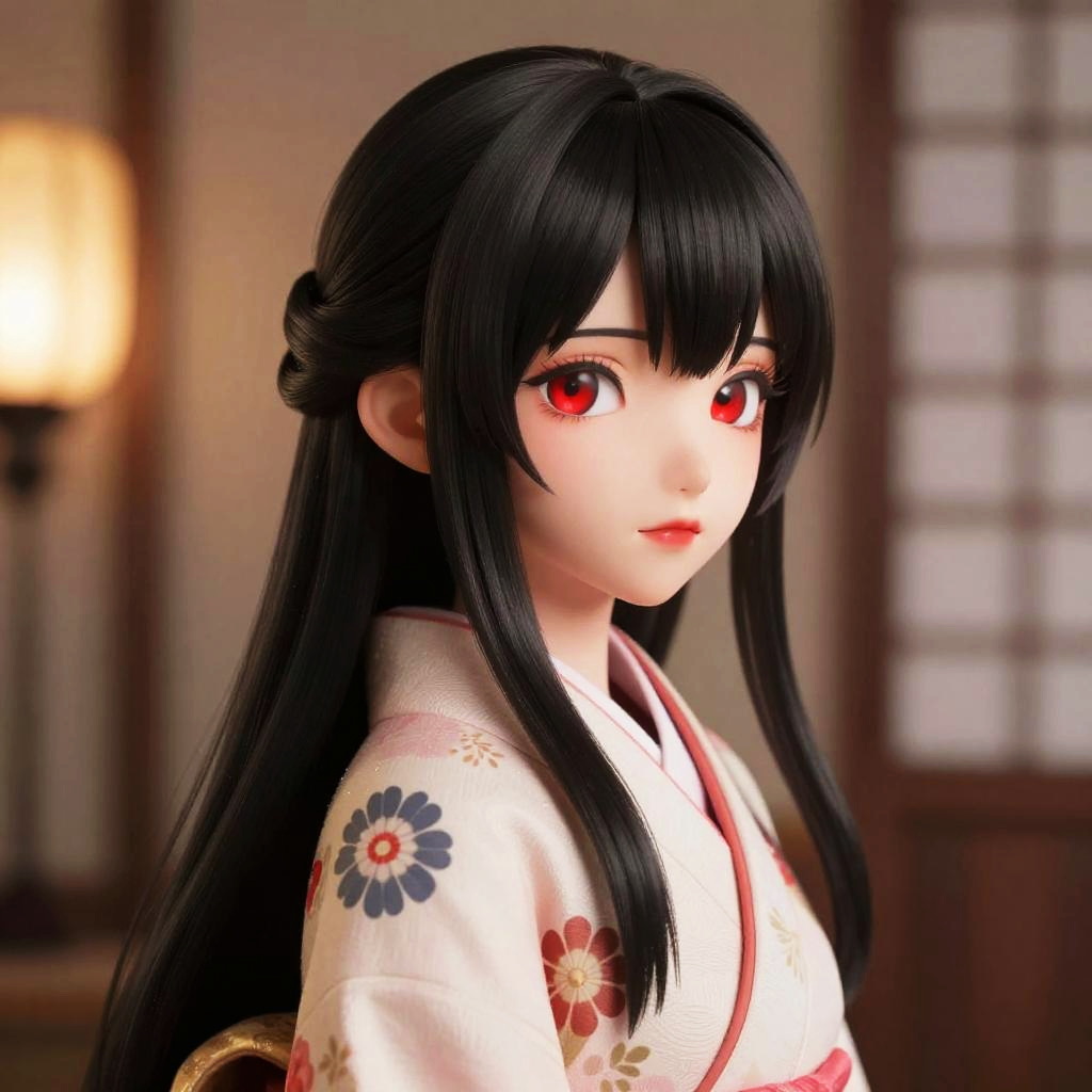 Digital anime-style portrait of a young woman with long black hair, red eyes, wearing a white floral kimono, softly lit room.