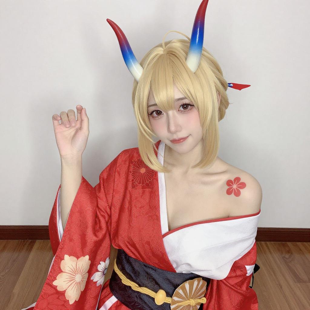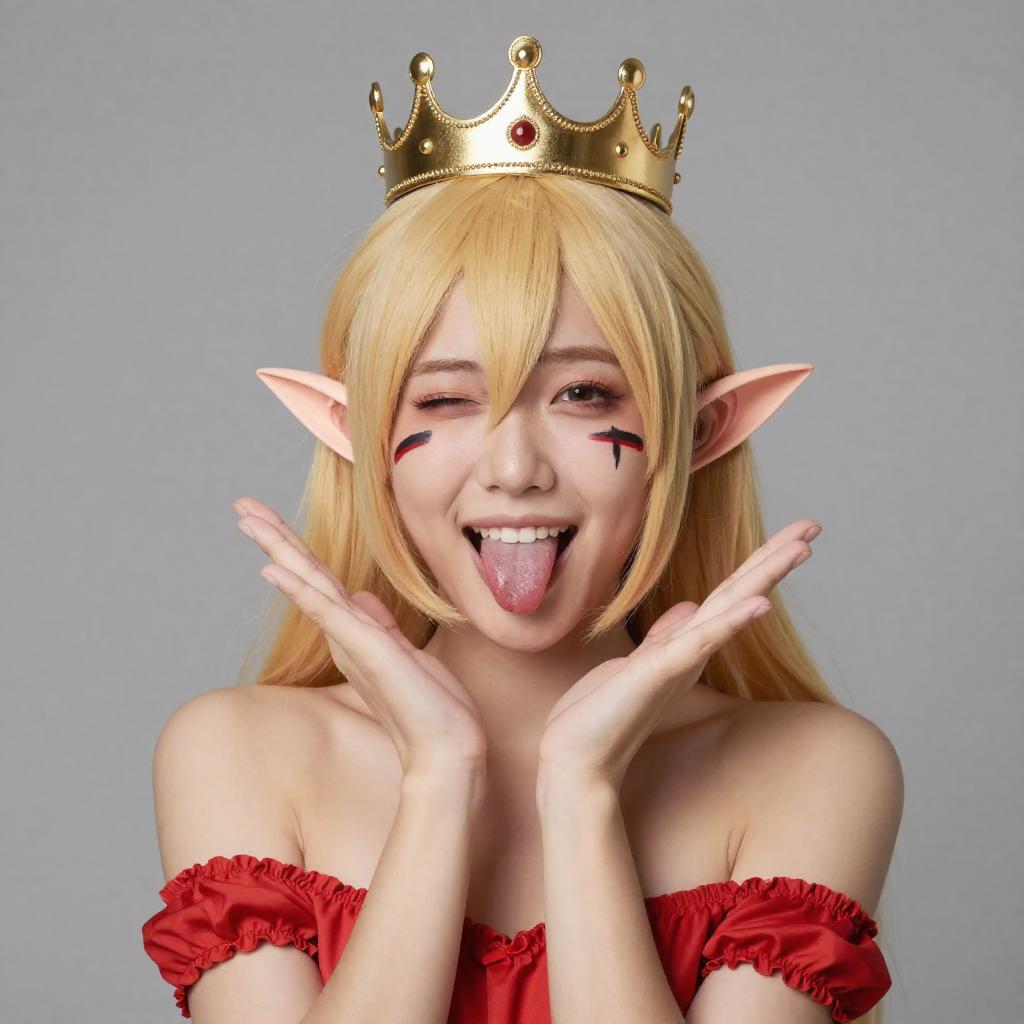 Photograph of a pale-skinned woman with blonde bob hair, elf ears, and red makeup, wearing a red dress with a gold choker and black star headpiece. She raises her right arm, looking at the camera with a slight smile. Bright lighting highlights her features against a plain white background.