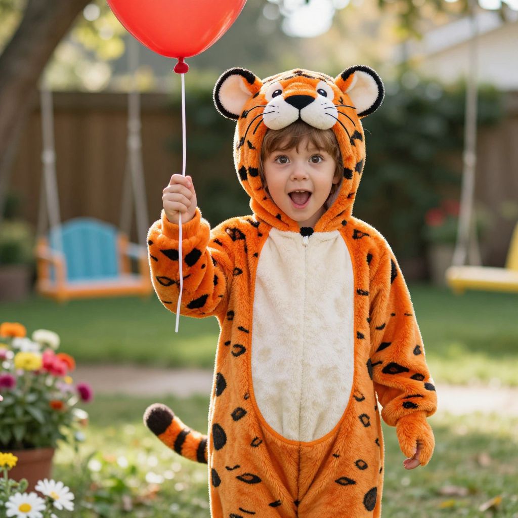 A young child is dressed in a tiger costume, wearing an orange outfit with distinct black spots and a black nose, standing confidently in a sunny backyard with flowers and a colorful swing in the background. The child has bright, curious eyes, a playful expression, and is holding a small red balloon. The scene is warm and joyful, with soft sunlight filtering through the trees, capturing the child's excitement and the festive atmosphere of the tiger costume.