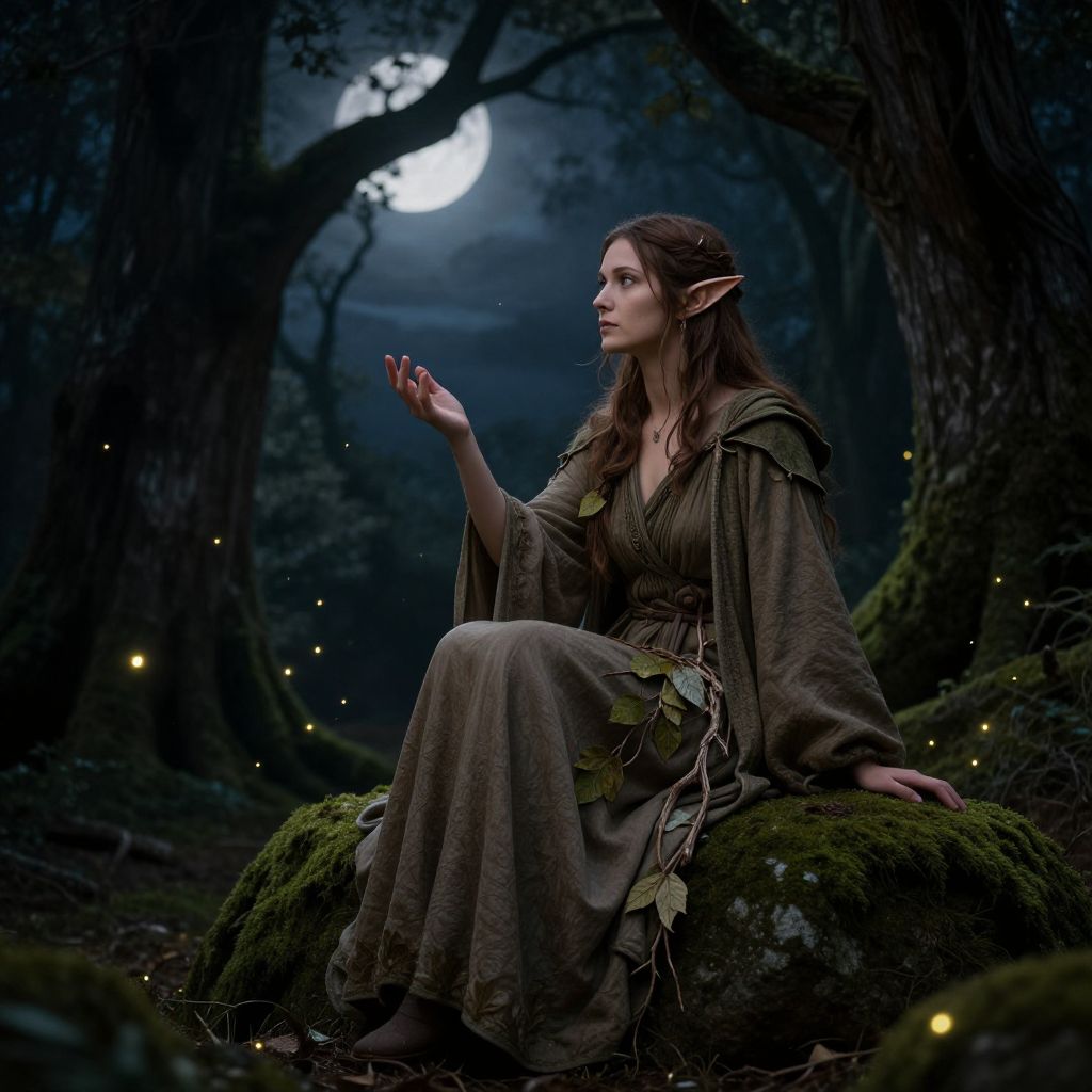 Ram braids hairstyle on a medieval bard, sitting by a campfire in an enchanted forest, rich woven hair patterns resembling ram's horns, soft warm lighting, rustic clothing, storytelling mood, highly detailed illustration.