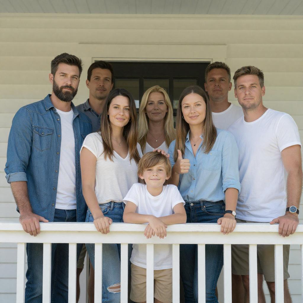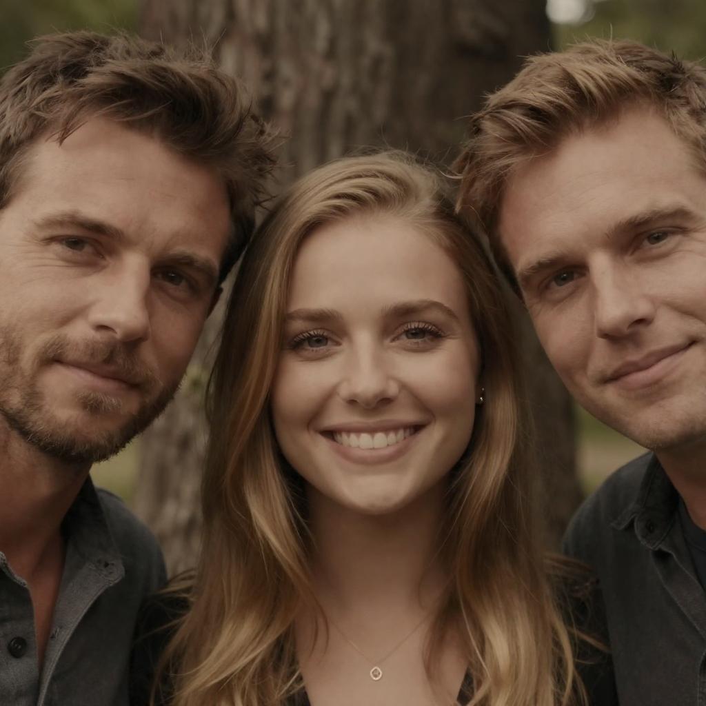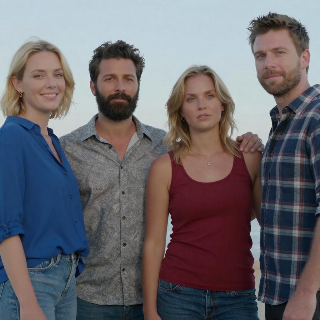 Photograph of four people standing together. Blonde woman in blue shirt, smiling, left. Bearded man in patterned shirt, middle. Blonde woman in red tank top, center-right, looking forward. Man in blue plaid shirt, right, touching her arm. Clear blue sky background. Casual clothing, relaxed poses.