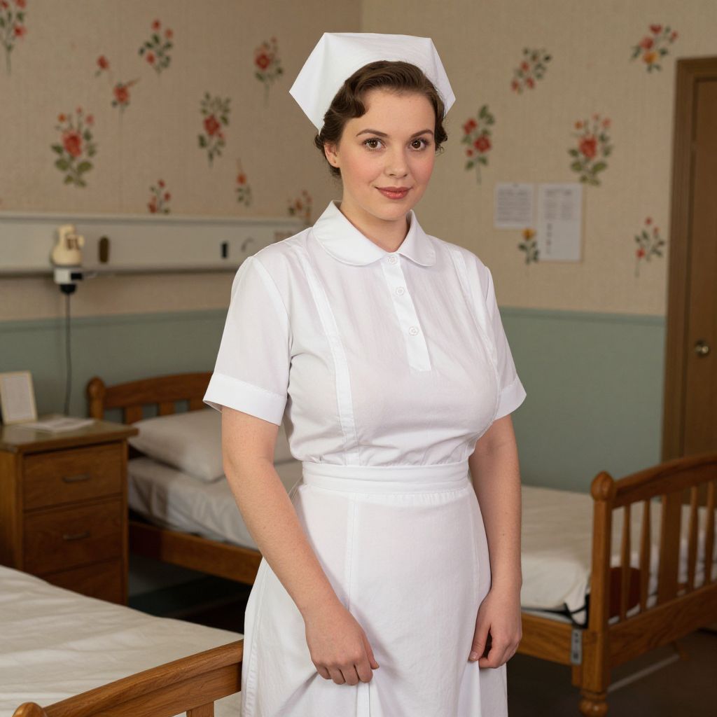 A detailed authentic photo of a 1930s-era nurse in a white cap and classic nurse outfit, standing in a sunlit hospital ward with floral wallpaper, wooden beds, and a vintage nurse's station in the background, the woman has fair skin, warm brown eyes, and a classic round face with a soft smile, her hands gently resting on the uniform's hem as she looks toward the camera.. The woman has big tits and cute face
