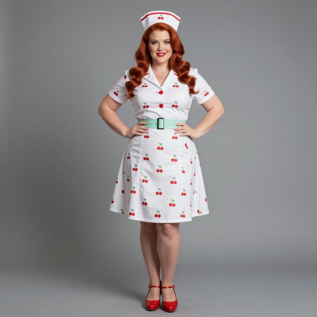 Plus size feelgood woman, photograph of a curvy woman in a beige nurse uniform with white trim, red cross on hat and sleeve, white belt, standing against grey curtain, long brown wavy hair, smiling, hands on hips, realistic style, studio lighting, full body, professional pose