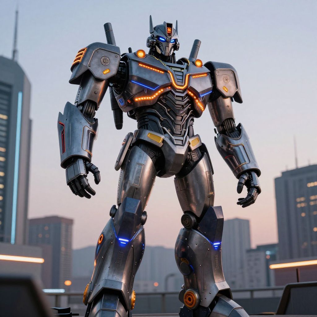 A big Halloween costume for a man, styled as a giant robot with metallic armor and LED lights, posing in a futuristic cityscape at dusk.
