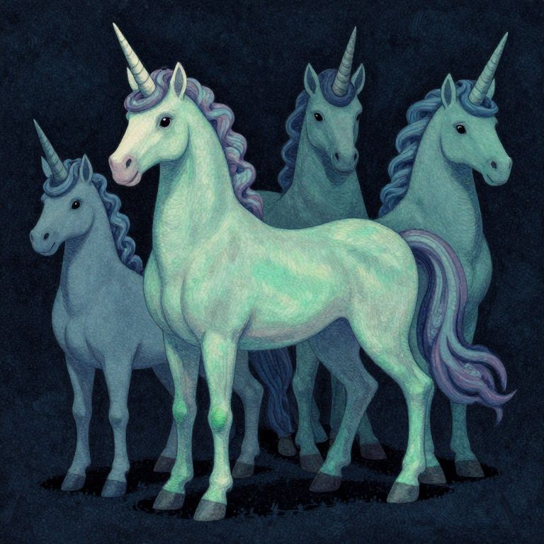 Ensemble /merfolk, antropomorphic, UNICORN, dark, moebius style, full body, blue green, 2d, pointillism, vintage comic style,