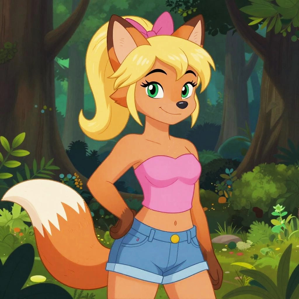 A colorful digital drawing of an anthropomorphic female fox with blonde hair in a high ponytail and pink bow. She has green eyes, a confident smile, and is wearing a pink tube top and blue denim shorts. Her orange fur contrasts with the lush, dark forest background filled with vibrant green plants. She stands with one hand on her hip, looking slightly to the side.