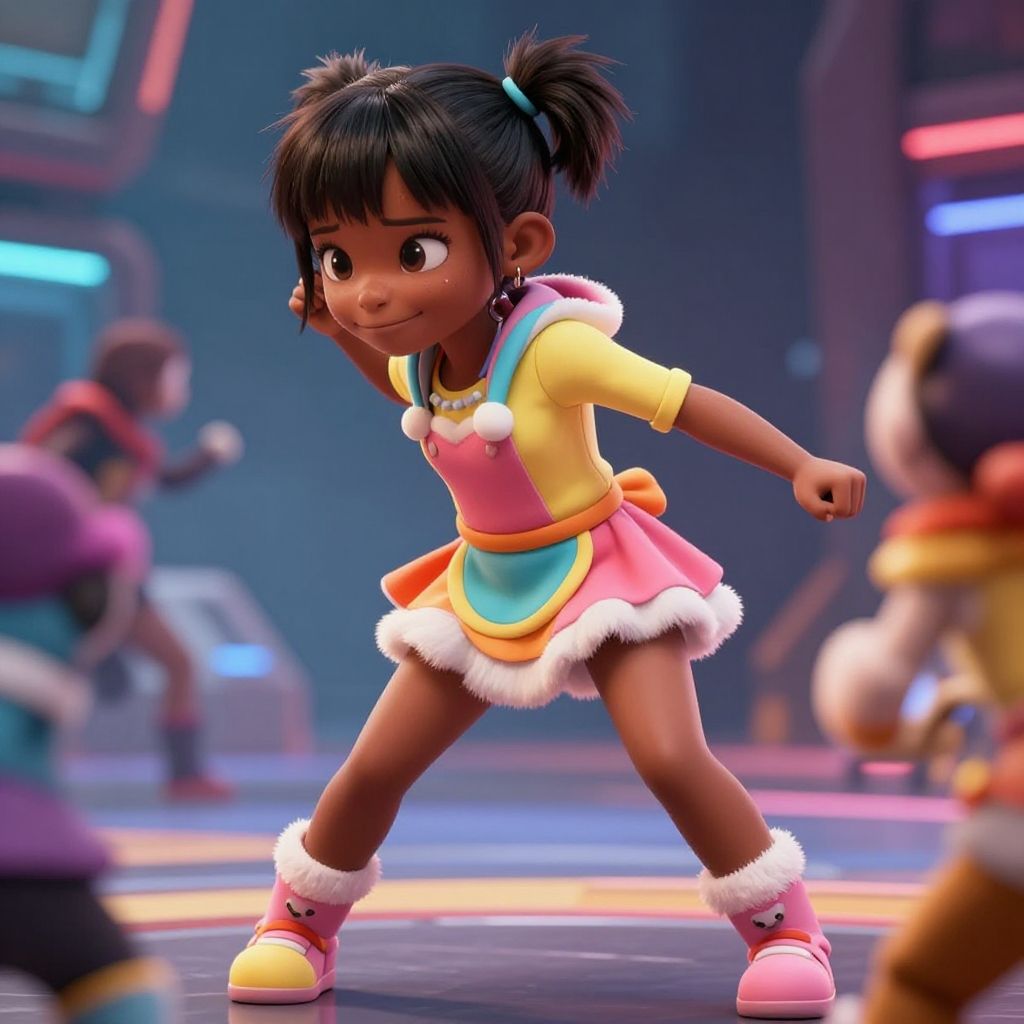 CGI image of a young dark-skinned girl with black hair in pigtails, wearing a yellow shirt, pink and orange dress with white fur trim, and pink shoes with white fur. She stands in a dynamic, fighting stance with a confident smile. The background is a blurred, vibrant, futuristic setting with neon lights and other children engaged in similar activities. The image has a colorful, cartoonish style with smooth textures and a playful, energetic atmosphere.