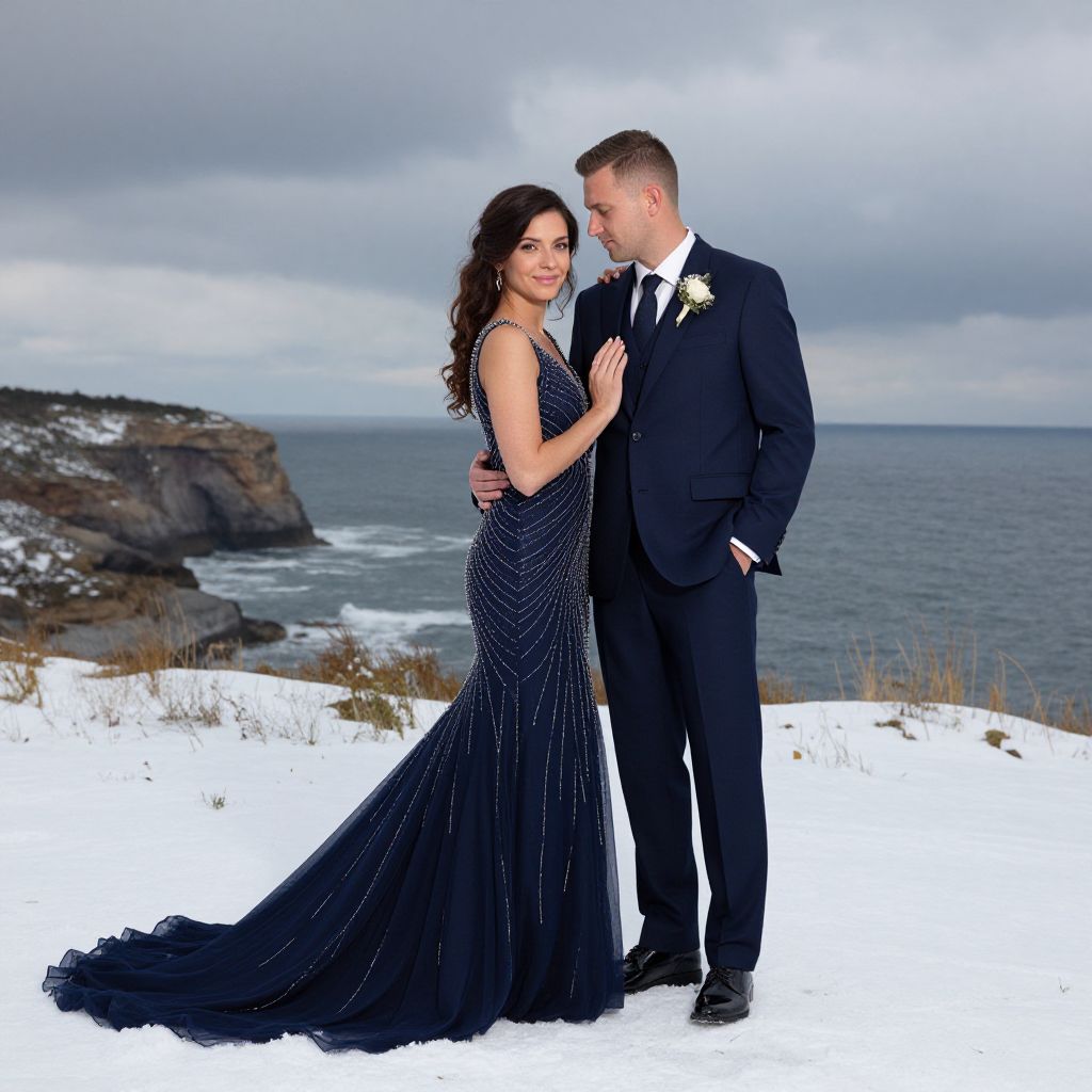 A romantic and elegant wedding scene set against a dramatic coastal backdrop, featuring a couple dressed in complementary navy blue attire—a woman in a flowing, beaded gown and a man in a tailored suit adorned with a floral boutonniere—captured in high-definition detail amidst a snowy landscape under moody, overcast skies.