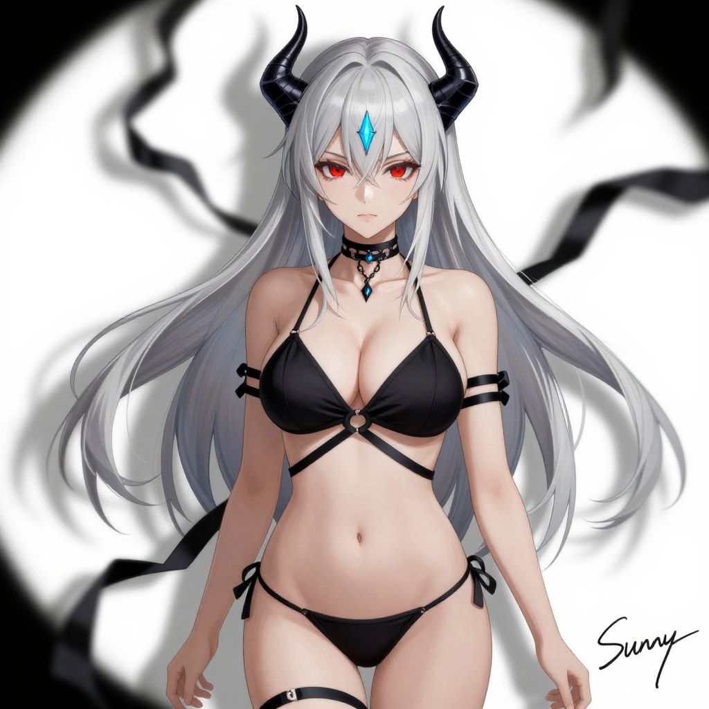 This digital anime-style drawing depicts a tall, slender, white-haired female demon with long, flowing hair and red eyes. She has black, curved horns on her head and a blue diamond-shaped gem on her forehead. She wears a black bikini with strappy details, revealing her ample breasts and toned midriff. A black choker with a blue gem adorns her neck. Her expression is serious, and she stands against a white background with black, swirling shadows. The artist's signature, "Sunny," is in the bottom right corner. The overall style is clean and vibrant, with a focus on her striking features and minimalistic background.