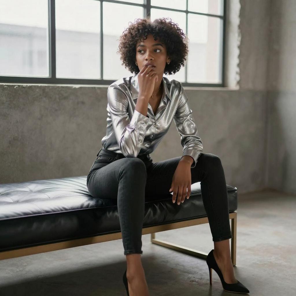 Photograph of a young Black woman with short, curly hair, sitting on a black leather bench in a bright, industrial-style room. She's wearing a shiny silver button-up shirt and black skinny jeans, with black high heels. She's thoughtfully biting her finger while looking slightly to the side. The background has a large window with black frames, letting in natural light, and a rough, concrete wall.