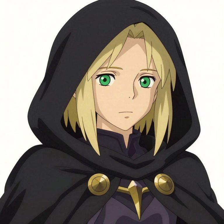 The image depicts a character with an angelic face, characterized by pale skin and striking green eyes. The character has dark blond, shoulder-length hair that frames the face. Wearing a dark roguelike garment, the character is adorned with a black hooded cloak that adds an air of mystery and depth to the attire. The cloak is intricately designed with gold accents, suggesting a high level of craftsmanship and attention to detail. The character's expression is serene and contemplative, with a slight hint of determination. The overall composition is balanced, with the character centrally positioned and the cloak framing the face, creating a sense of harmony and focus. The Ghibli-style, anime-inspired aesthetic is evident in the soft, rounded features and the overall ethereal quality of the image.