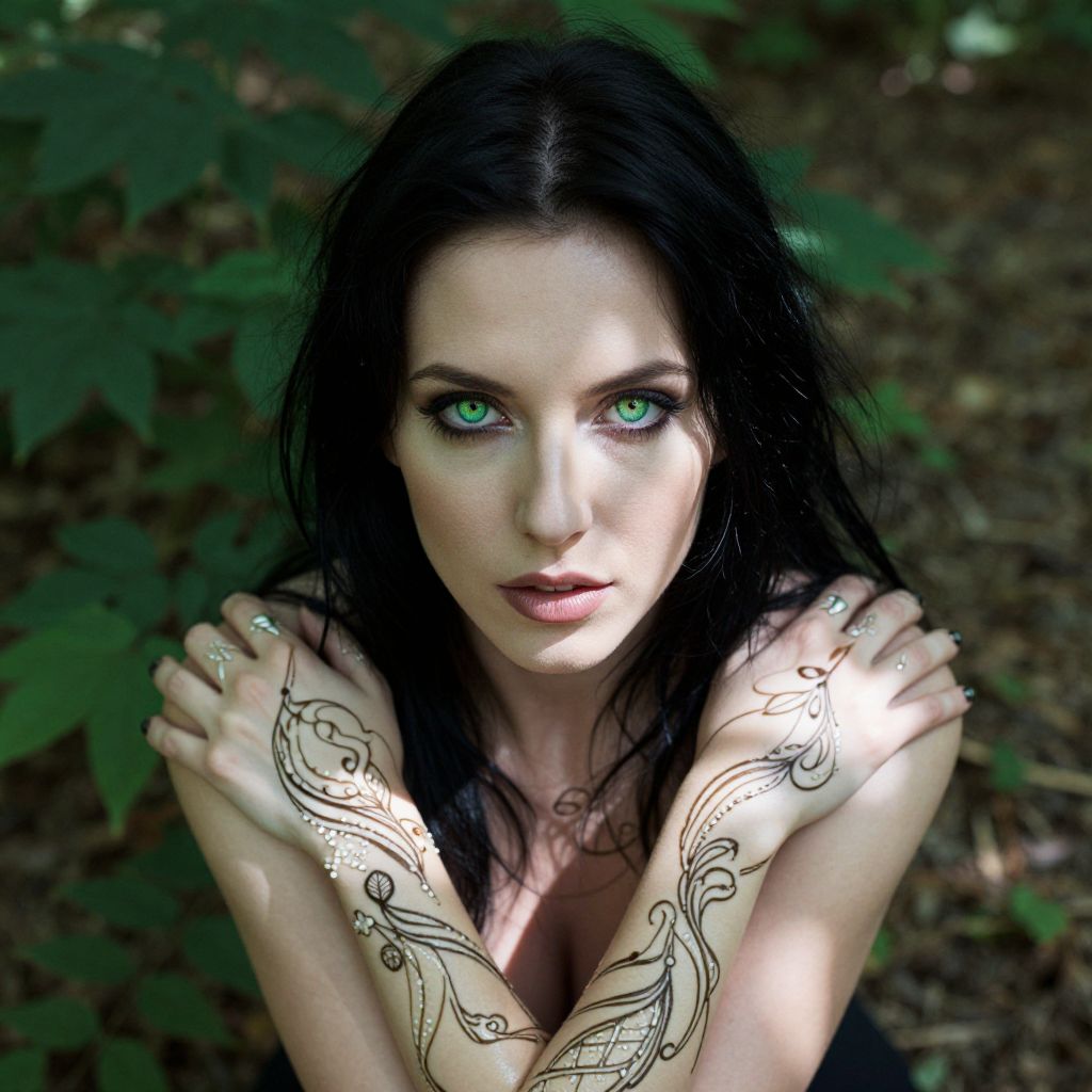 Envision a captivating portrait of an enigmatic Eastern European woman, her mesmerizing green eyes and raven-black hair illuminated by a unique high-angle perspective. Her porcelain skin is adorned with intricate henna patterns resembling ethereal vines winding around her arms. The lush forest backdrop creates a mesmerizing interplay of dappled sunlight filtering through the leaves, casting a symphony of light and shadow upon her enigmatic expression, evoking serenity and intrigue.