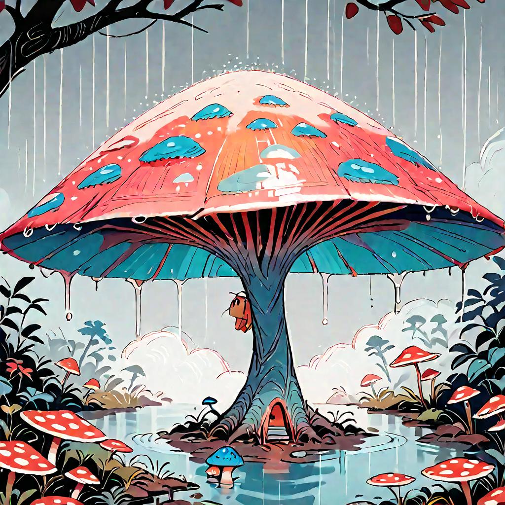 Score_9, score_8_up, score_7_up, rating_safe, rain falls heavy as a tiny frog finds shelter under a mushroom, source_anime, a1