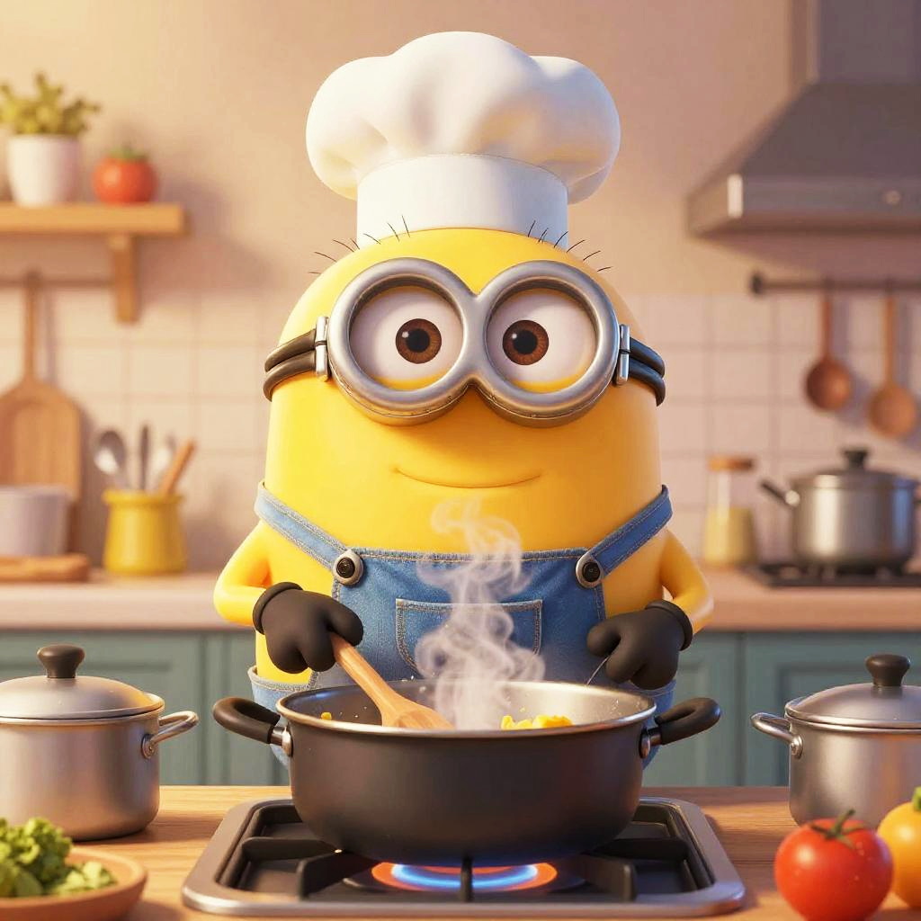 Big fat minion cooking in a cozy kitchen, surrounded by pots and pans, wearing a chef's hat and apron, steam rising from a big pot, warm lighting, whimsical and fun illustration