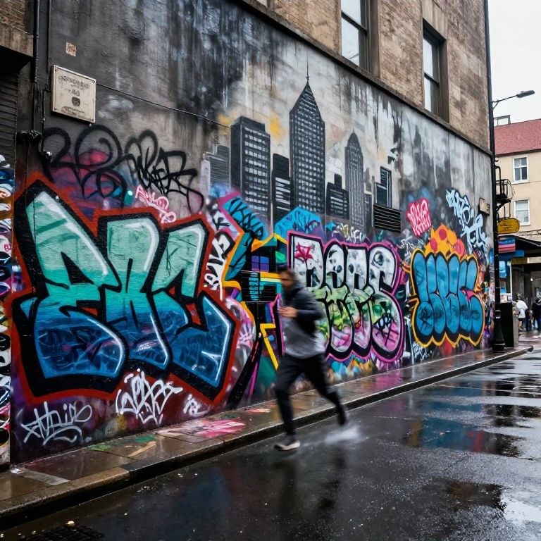 Cracked statue amidst a modern urban wasteland, graffiti on the surfaces, broken limbs, contrasting vibrant street art and eerie decay, dusk lighting with neon glows