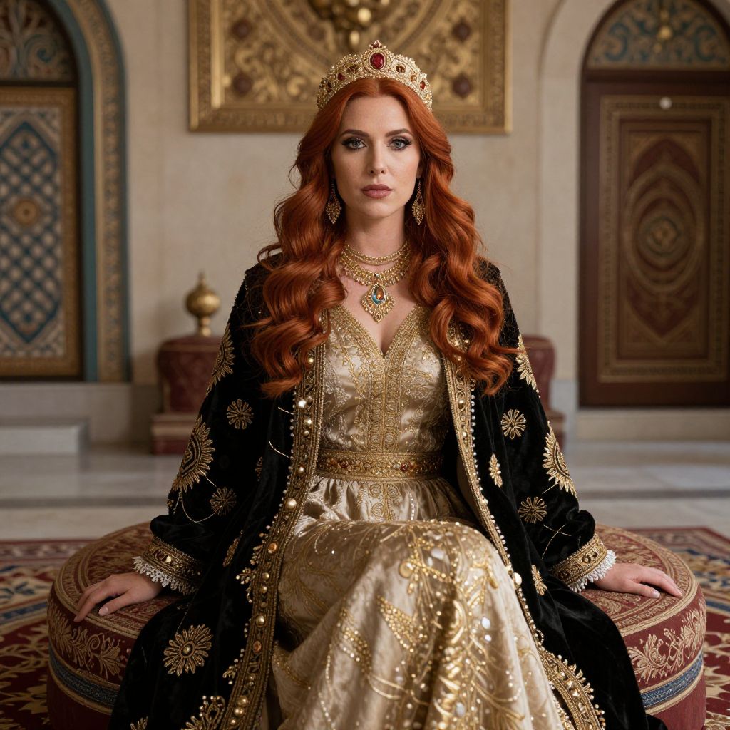 Simulation a gorgeous woman with red hair sitting in a thrown in Ottoman palace with traditional Ottoman style clothing, orientalist, looking directly at camera, assertive,