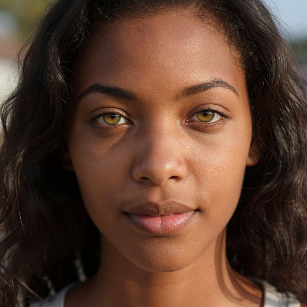 Using a mirrorless camera, capture a detailed close-up portrait of a young Caribbean woman with subtle imperfections and an olive complexion, glowing softly from the sun's kiss. Her dark brown hair falls in loose waves around her face, highlighting high cheekbones and full lips. The woman's eyes, a captivating mix of green and gold flecks, exude wisdom and warmth. She wears an expression of calm introspection, with a faint smile gracing the corners of her mouth. Soft natural lighting enhances her features, casting gentle shadows that add depth to her delicate facial structure. The background is gently blurred, drawing focus to her captivating gaze.